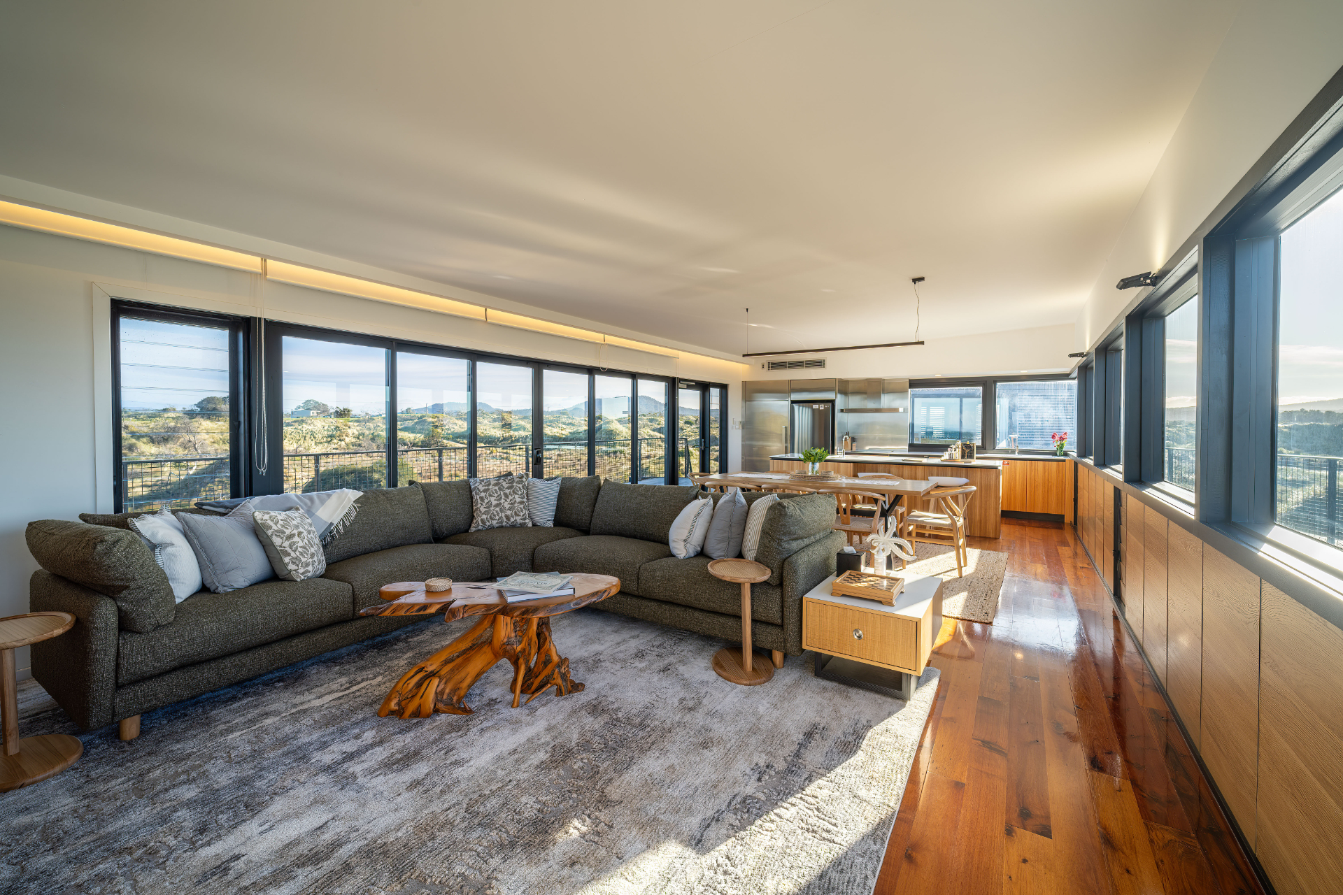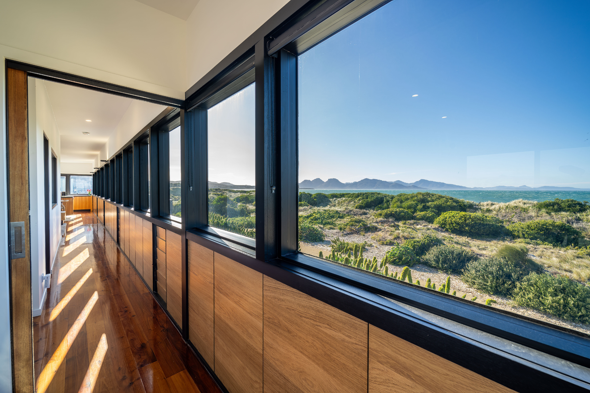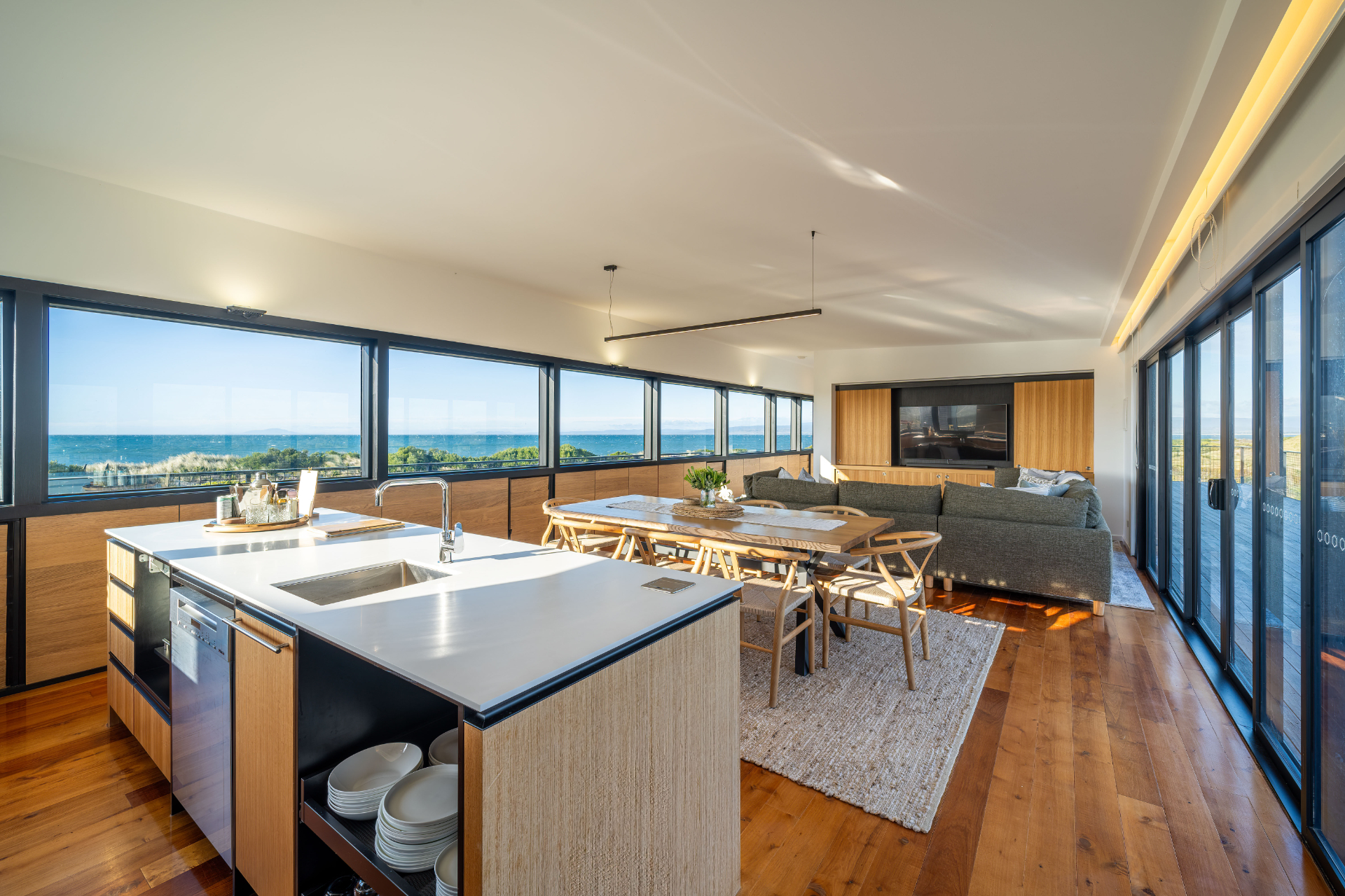 The house has been mindfully designed to sit peacefully amongst this scenic landscape. The interior has crisp, clean lines, continuously drawing your eyes out to the stunning views.