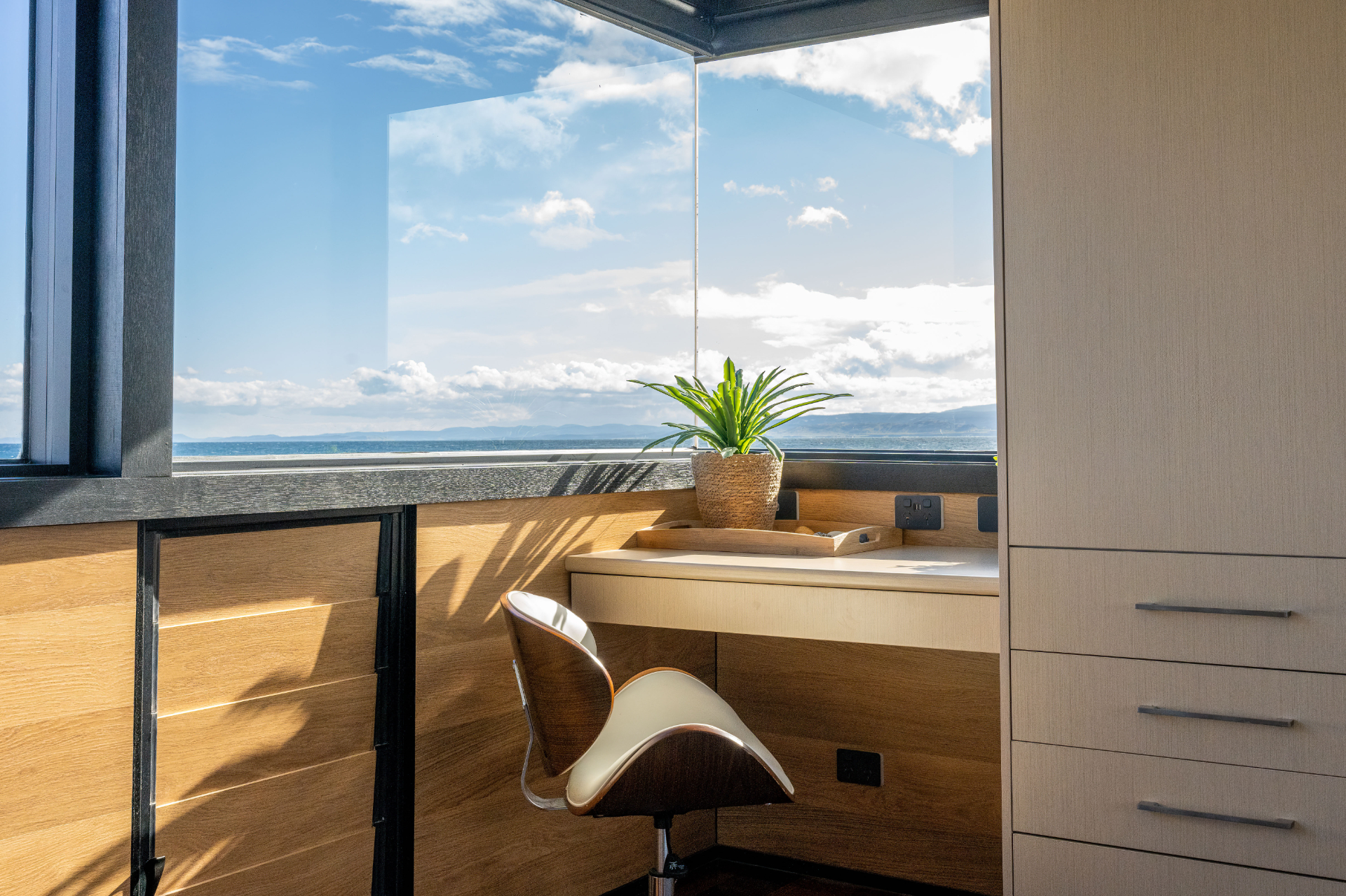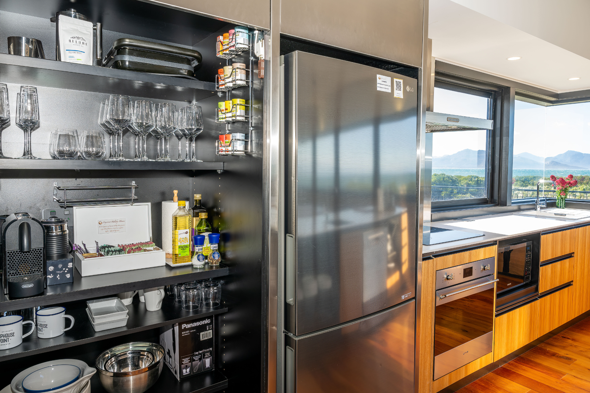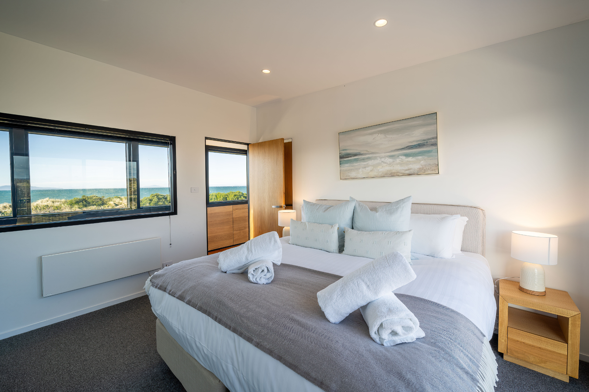 The house has been mindfully designed to sit peacefully amongst this scenic landscape. The interior has crisp, clean lines, continuously drawing your eyes out to the stunning views.