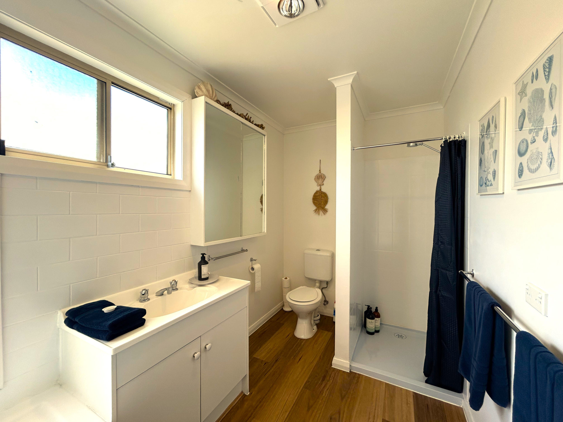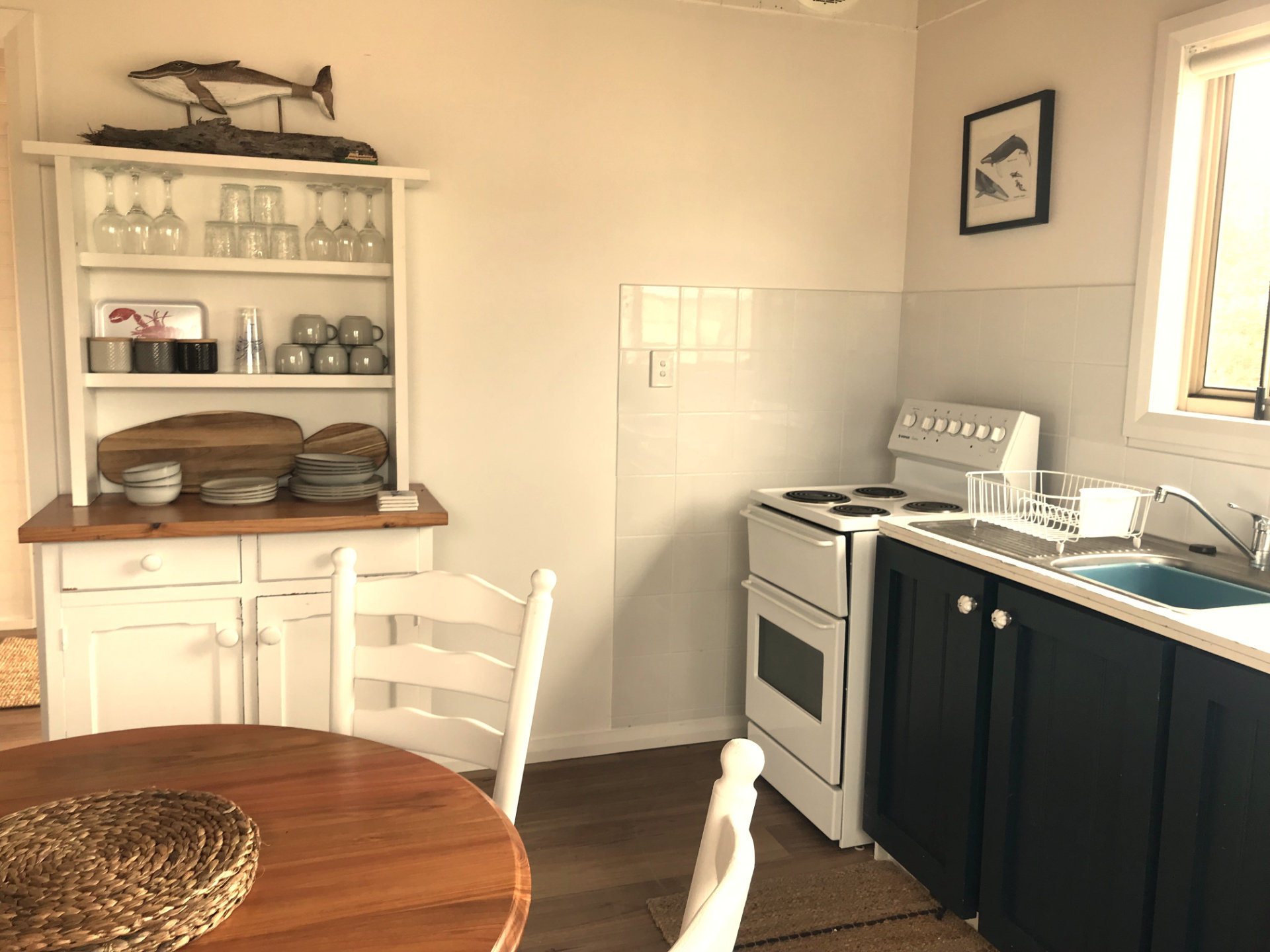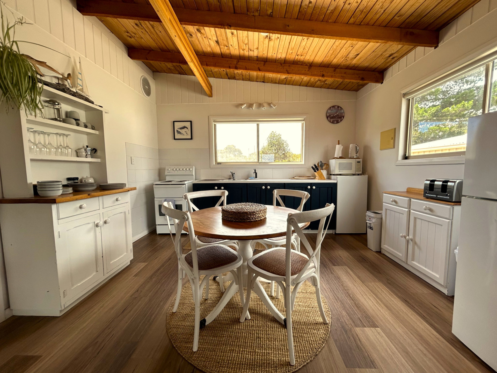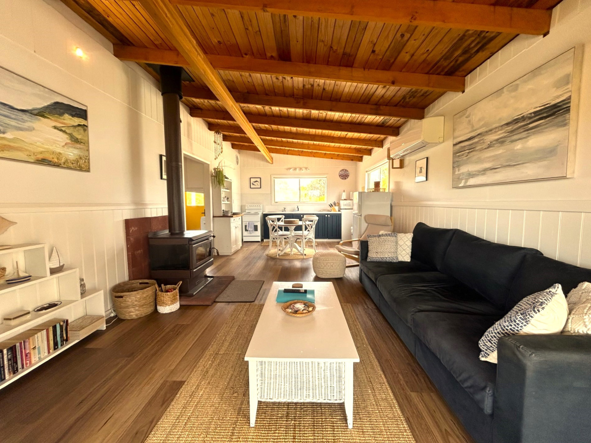 Driftwood Cottage is fully equipped for a comfortable stay. The kitchen has everything you need to cook your own meals, including a stove, oven, microwave, refrigerator, and cooking basics. The home also includes modern amenities such as a Smart TV, sound system, Wi-Fi, air conditioning, radiant and split system heating, and a wood heater for cosy winter nights. There’s also a washing machine, clothing storage, an iron, and a drying rack for convenience.