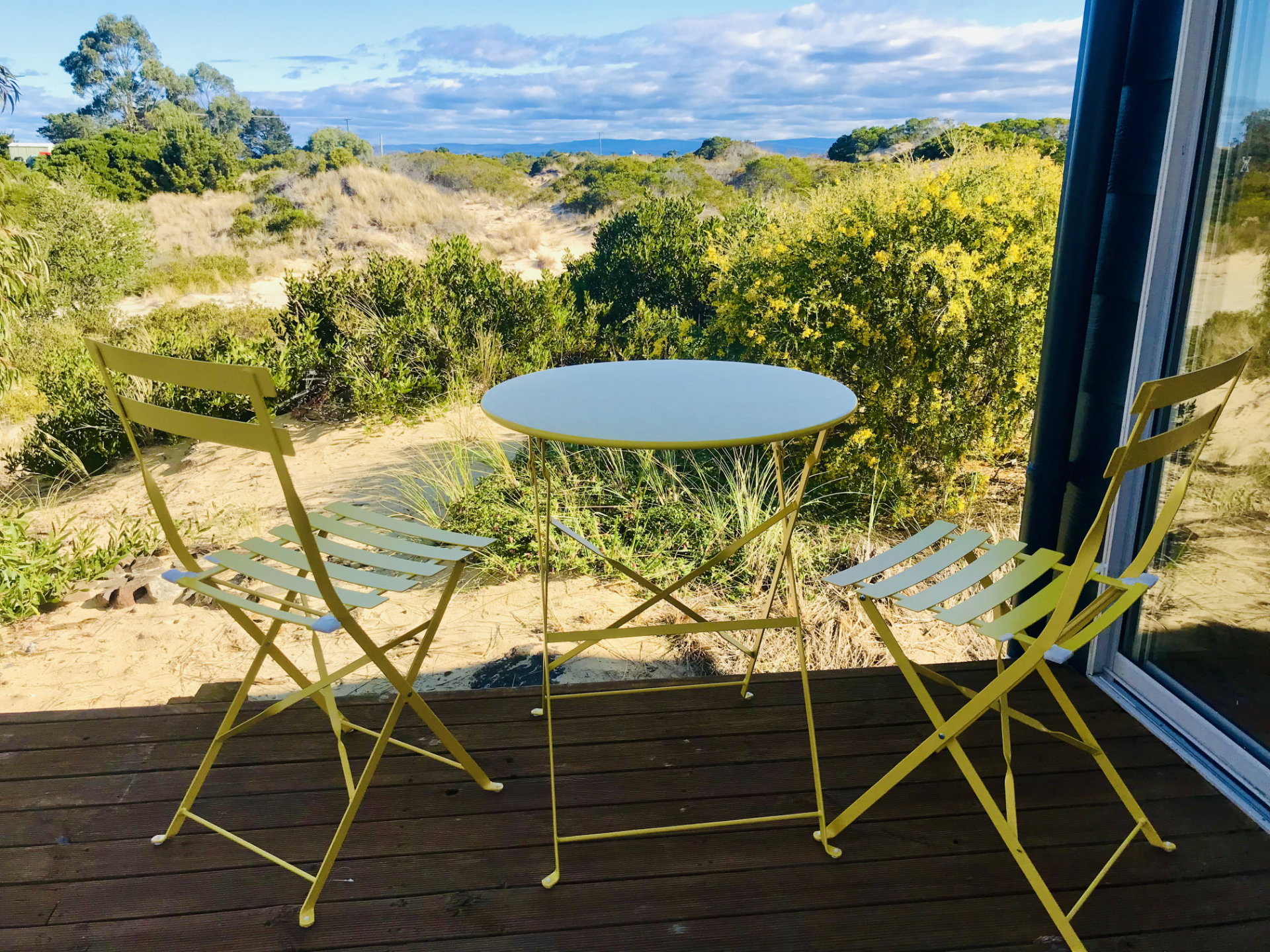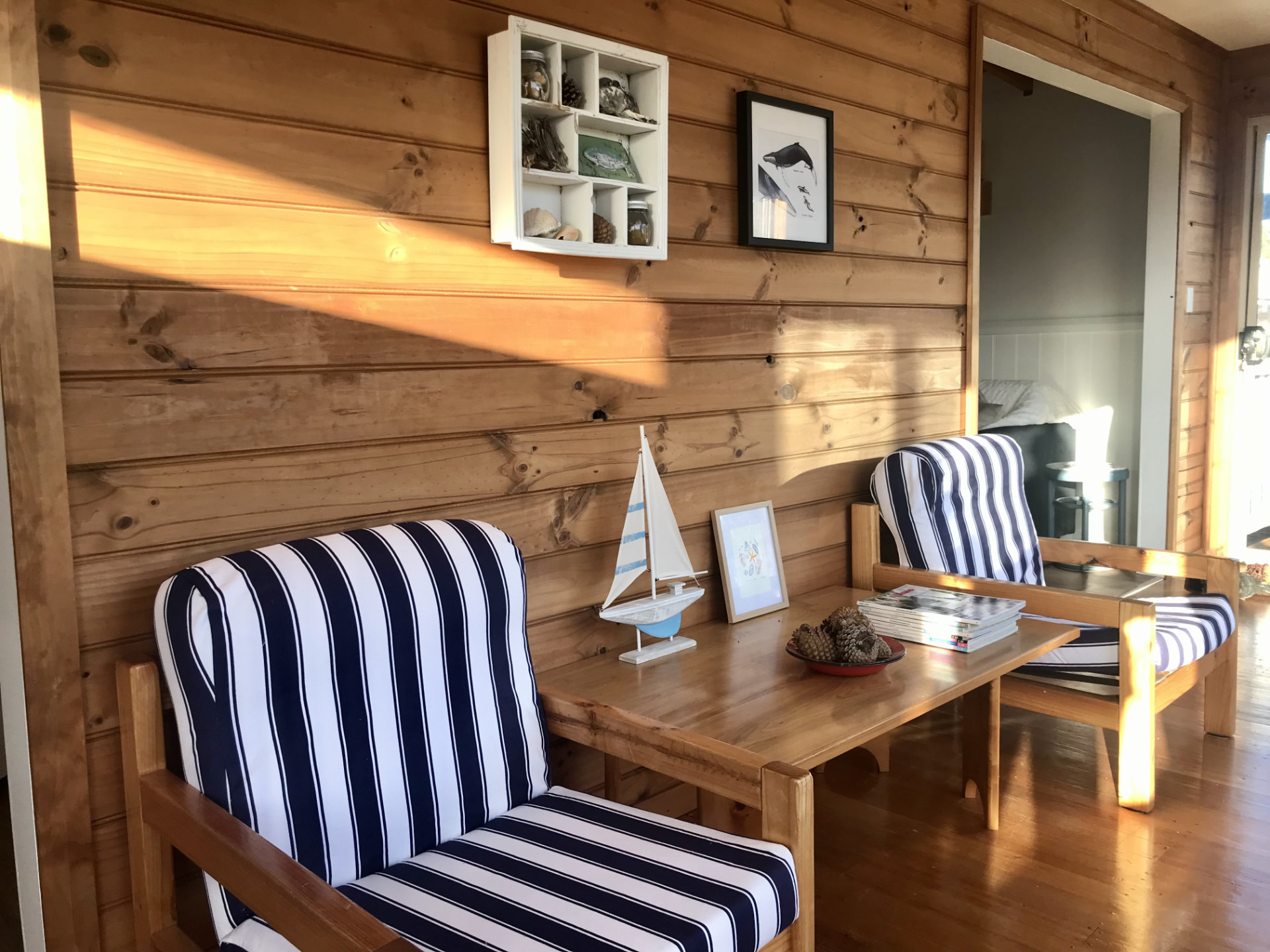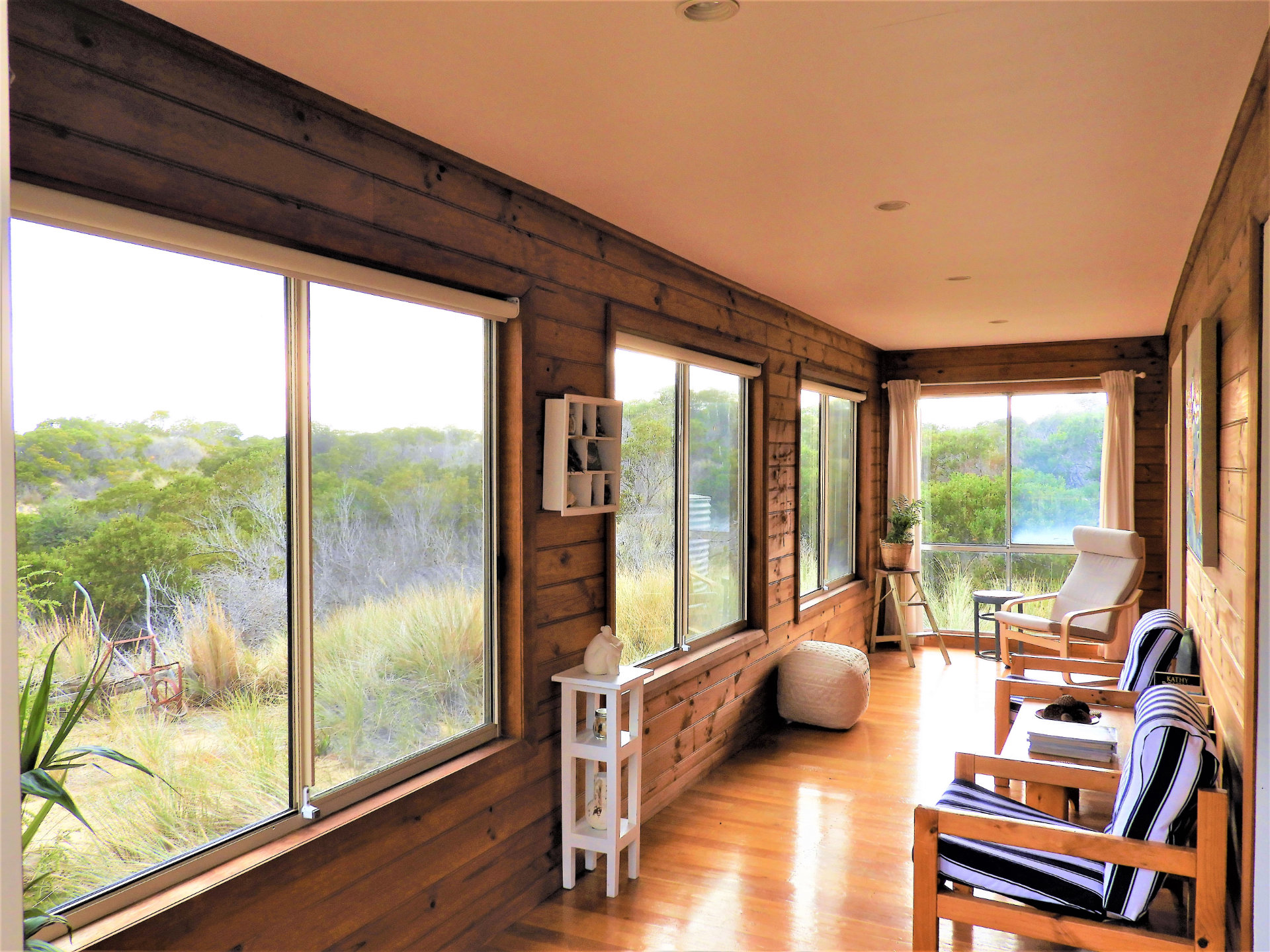 Outdoors a small coffee table creates a peaceful space to relax with a drink and watch the light change across the landscape. The property is just a short walk to Nine Mile Beach, giving you easy access to long walks along the pristine sand, swimming, or simply enjoying the coastal air.