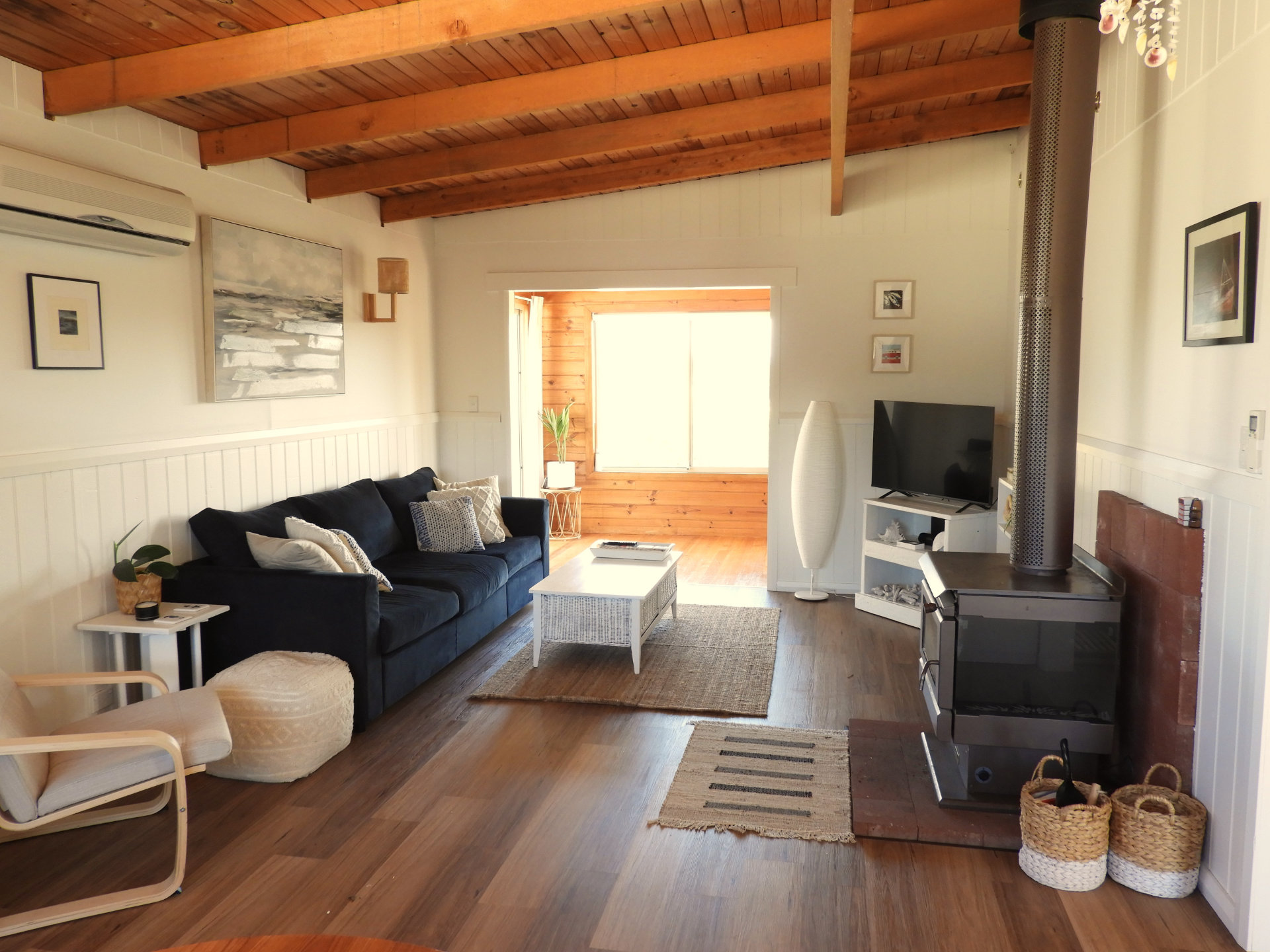 Driftwood Cottage is a charming and cosy beach shack designed with thoughtful coastal touches, where every detail has been considered to create a warm and inviting retreat. Step inside to discover a sunroom that looks out across the rolling dunes to the distant mountains, a perfect spot to curl up with a book, enjoy a cup of coffee, or simply take in the serene scenery. The interior is designed to reflect relaxed beach shack vibes, with thoughtful décor, comfortable furnishings, and little touches throughout that make you feel right at home.