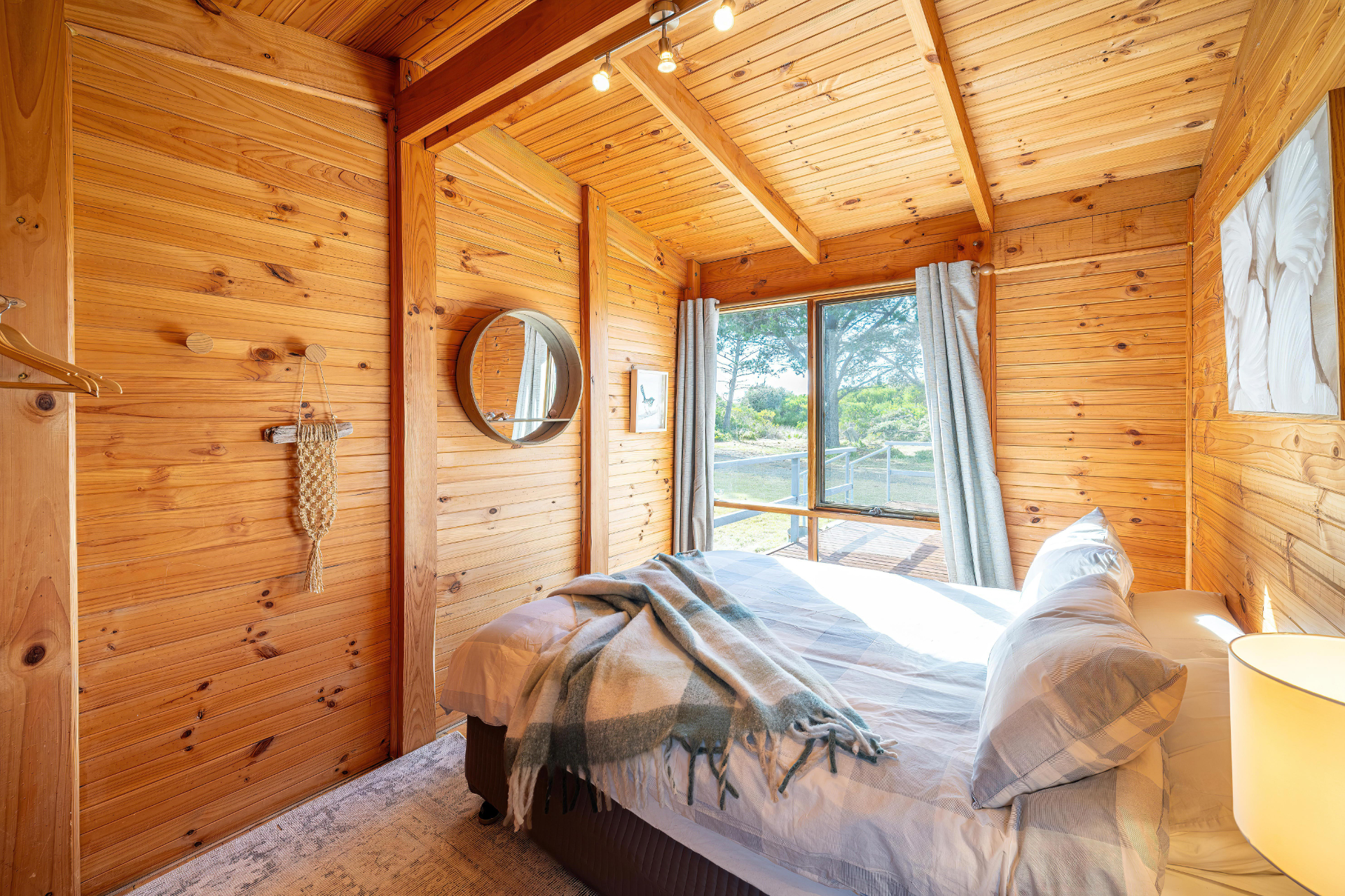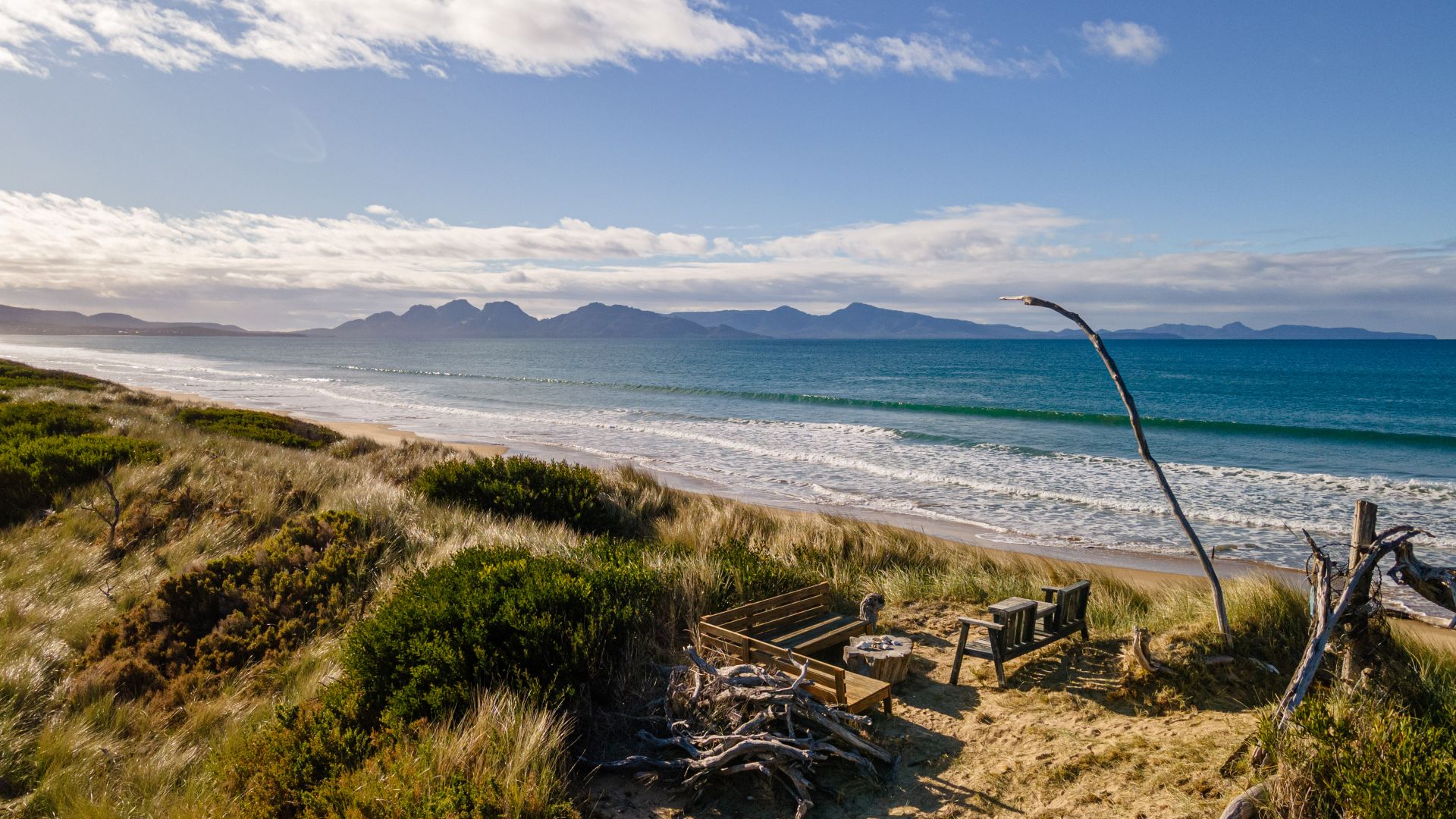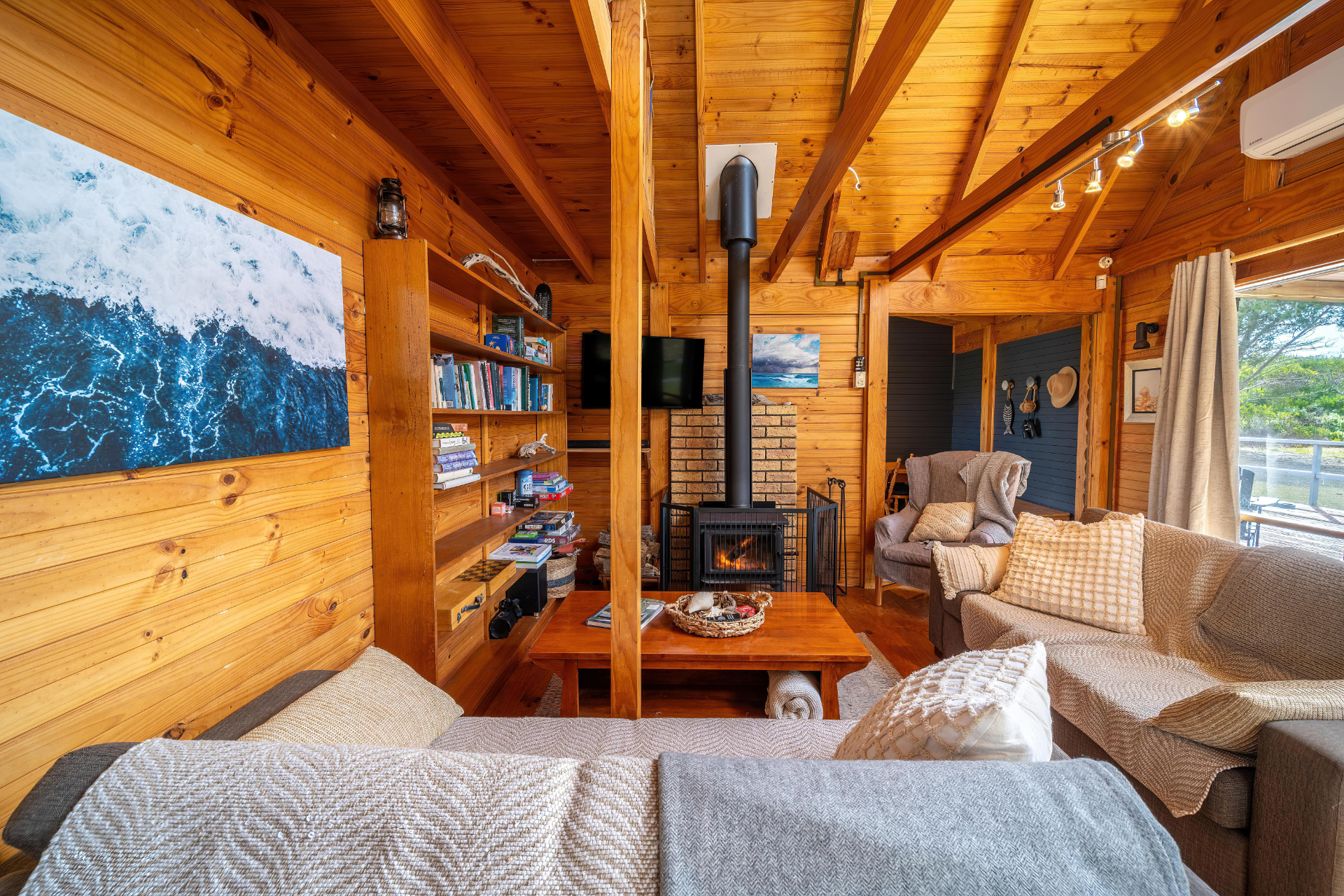 Small, charming, and full of character, this beachside hideaway offers woodfire warmth all year round, perfect for curling up with a book on chilly evenings or enjoying a relaxed glass of wine as the fire crackles. Step outside to direct access to Nine Mile Beach, where you can sink your toes into the sand, take a brisk surf, or enjoy a peaceful stroll along the shore. After a swim or surf, rinse off in the outdoor shower, embracing the fresh sea breeze as you wash away the day. For quiet moments, climb to the dune-top seating, where panoramic views of Freycinet Hazards, sunrises, and sunsets create an unforgettable backdrop for morning coffee or evening drinks.